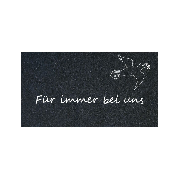 Setzen Sie ein bewegendes Zeichen der Erinnerung mit unserem edlen Granitstein „Für immer bei uns“. Der hochwertige Naturstein im Format 30x20cm und einer feinen Stärke von 1cm besticht durch seine schlichte Eleganz. Zart verziert mit einer sanft schwebenden Taube und dem Schriftzug „Für immer bei uns“ wird er zu einem tröstenden Symbol für Frieden, Liebe und bleibende Nähe. Ein besonderer Erinnerungsstein für all jene Orte, an denen die Erinnerung lebendig und spürbar bleibt.